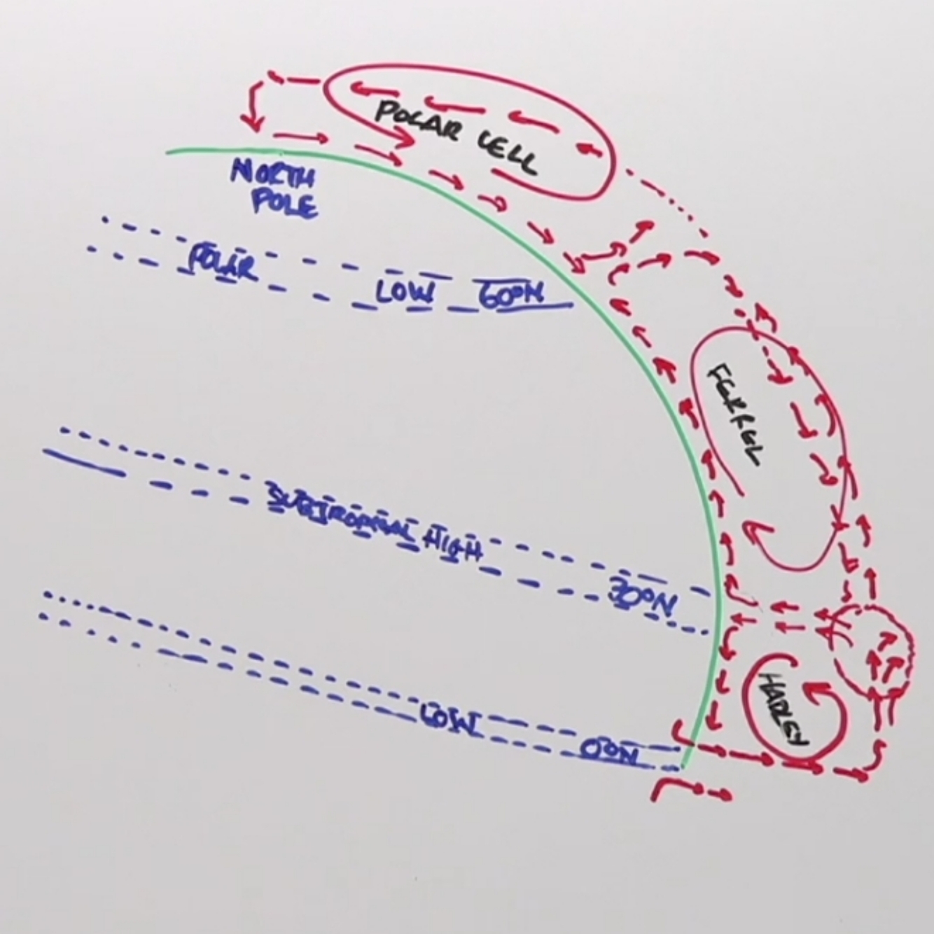 * Farrel Cell: Winds blow North (up) and to the left (If your back was to the pole) and blow from west to east.