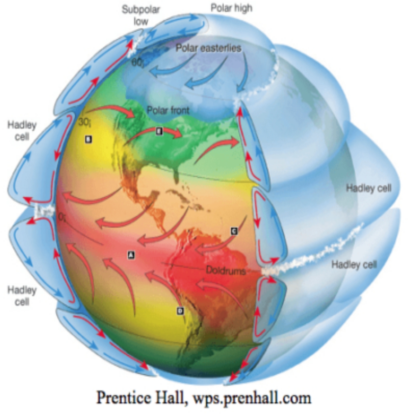 * Polar Cell: Winds blow down and to the right (if you had your back to the pole) and blow from east to west.