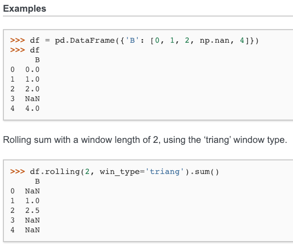 Rolling sum with a window length of 2, using the ‘triang’ window type.