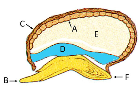 In einem Test mit dem Reagenz Triphenyltetrazoliumchlorid (TTC bzw. TZ) kann die Vitalität eines Samens noch vor der eigentlichen Keimung bestimmt werden. Wählen Sie eine mögliche Region aus, in der nach Einwirkung dieses Indikators bei vitalen Samen typischerweise eine rote Färbung zu erwarten ist: ___ (A, C, D, E)