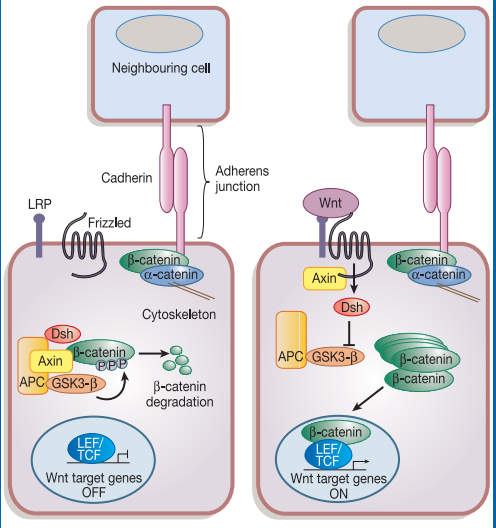 In the absence of Wnt signalling (left panel), β-catenin is in a complex with axin, APC and GSK3-β, and gets phosphorylated and targeted for degradation. β-Catenin also exists in a cadherinbound form and regulates cell–cell adhesion.