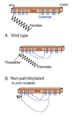 Wnts are 350-400 aa secreted gylcoproteins that contain conserved cysteine residues. There are at least 19 human Wnts. They are palmitylated in the ER by Porcupine, resulting in their being very hydrophobic.