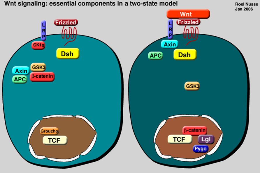 Wnt absence: Frizzled and Arrow are not bound by Wnt, and the destruction complex (Axin, APC, GSK3) leads to the phosphorylation and breakdown of beta-catenin.