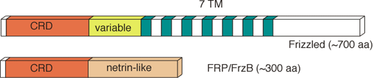 The mammal homolog to Frizzled is a frizzled-related protein known as FRP/FrzB. There are at least 11 vertebrate Frzs. FrzB is a Wnt-binding protein important in embryonic development. FrzB is localized in the plasma membrane. Unlike Frizzled, FrzB lacks the 7 transmembrane domains normally found in G-protein-coupled receptors. It is still considered a homolog of Frizzled because it contains a Cysteine Rich Domain (CRD), and because of its intracellular C-terminus which is crucial for signaling. Secreted FRP/FrzB proteins modulate signalling, and extracellular loops may also bind Wnt and activate signalling.