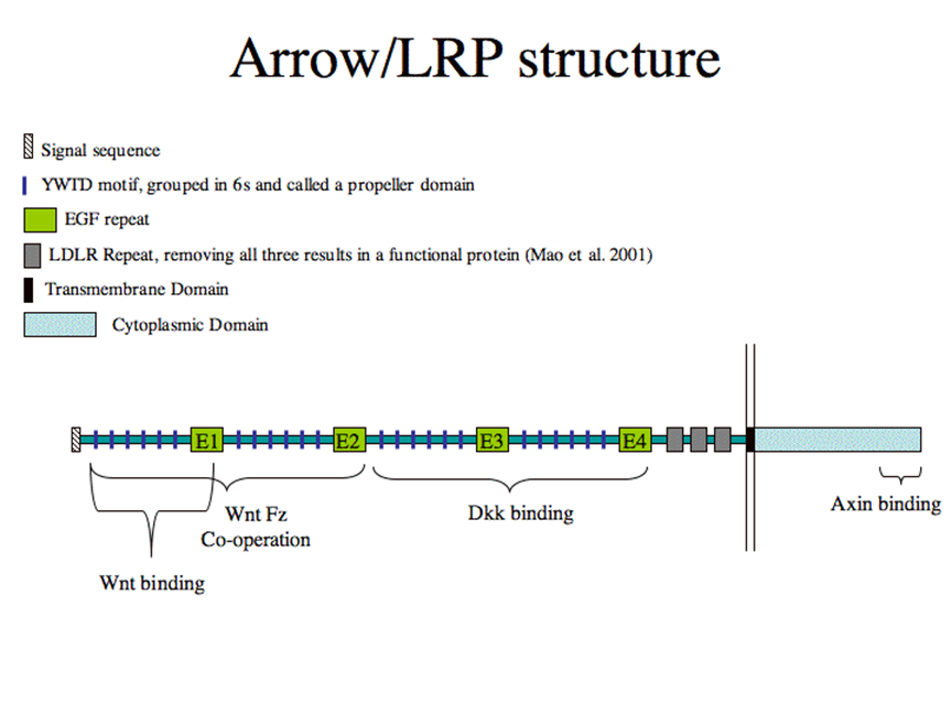 Cloning of Arrow mutants found homology to LRP5/6 in humans/vertebrates which codes for LRP (Low density lipoprotein receptor Related Protein), which binds Wnt and Frizzled.