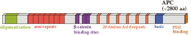 APC is a tumour supressor gene with cellular roles including regulation of microtubules. It encodes a large protein, APC, which has different domains and interacts with several different proteins, including E-cadherin. APC antagonises Wnt signalling.