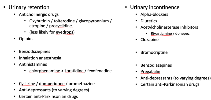 Drugs with the SE of increased risk of urinary retention / incontinence