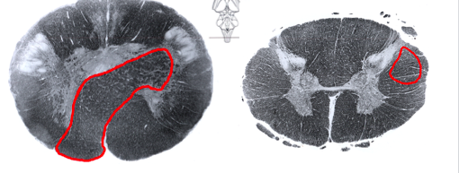 If lesionned at thoracic levels of the spinal cord, the tract shown in red could lead to: