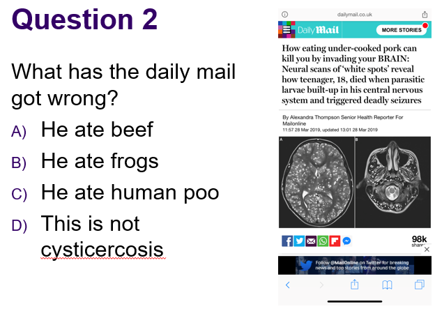 Cysticercosis: dying worms cause trouble - Ruptured cyst -> spread/anaphylaxis - content of cyst is parasitic and hidden by the immune system