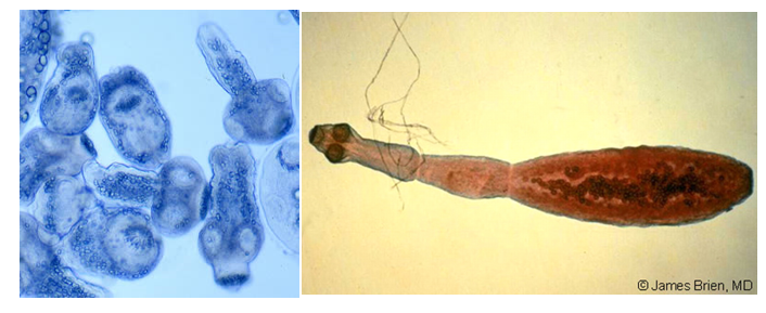 * rapid parasite mediated damage - tissue damage as humans not natural host - parasite and human die