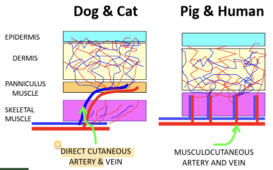 What about dog and cat skin circulation (vs pigs and humans) makes axial pattern flaps possible (vs grafts)? What about the anatomy of this ciruclation impacts what layers must be included in wound closures?