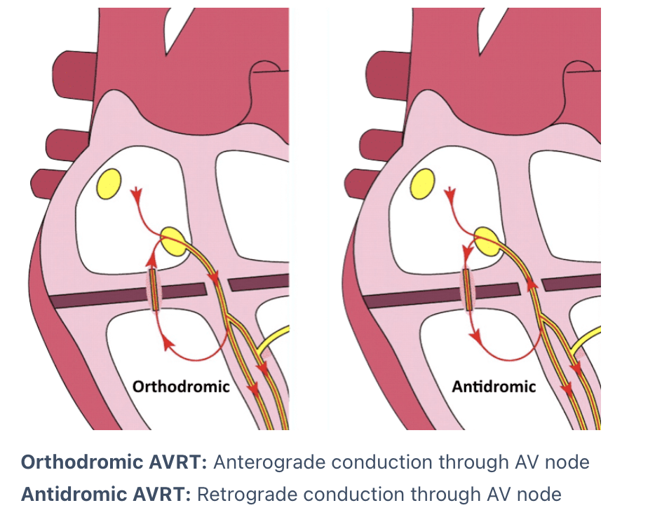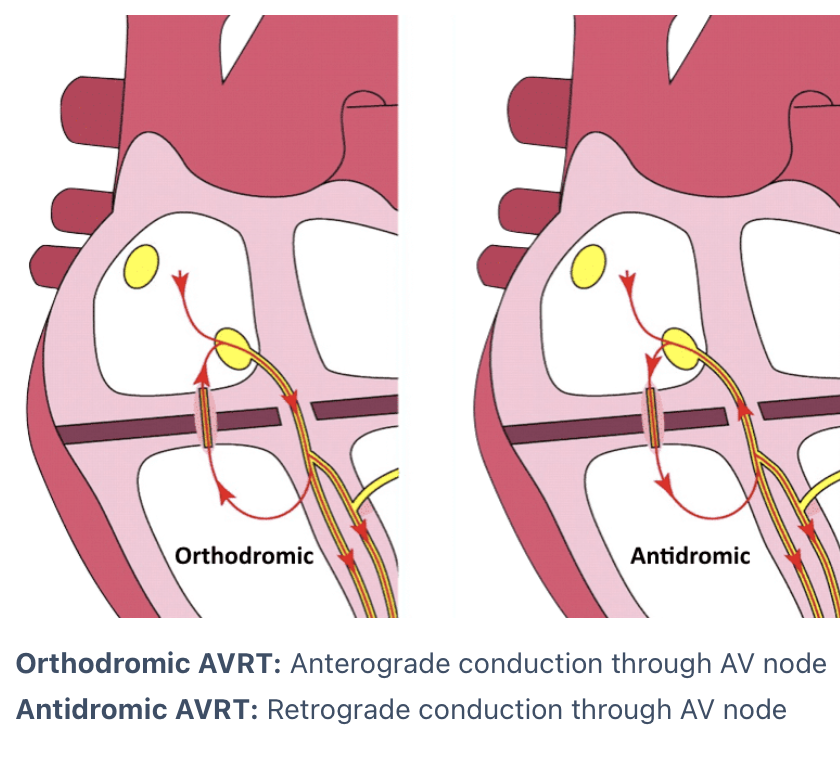 In antidromic AVRT, anterograde conduction is via the accessory pathway (AP), producing a regular wide complex rhythm. This can be difficult to distinguish from ventricular tachycardia (VT)