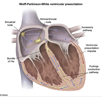 Atrial fibrillation, atrioventricular reentrant tachycardia (AVRT), and rarely, ventricular fibrillation.