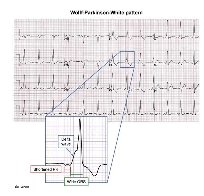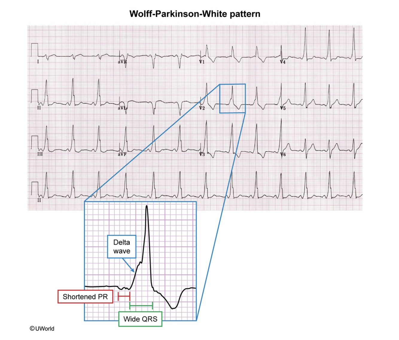 Although patients with a WW pattern on ECG can be asymptomatic, some develop tachyarrhythmias; the combination of WW findings on ECG and symptomatic tachyarrhythmia constitutes WW syndrome. Paroxysmal supraventricular tachycardia is the most common arrhythmia; it is usually a regular, narrow complex tachycardia. If patients with WW develop atrial fibrillation, they can conduct down the accessory pathway from the atria to the ventricles at a very fast rate, commonly resulting in syncope. This patient’s ingestion of energy drinks, a known precipitant of atrial fibrillation, likely placed him at risk for such a scenario. Alcohol can can also act as a cardiac irritant and promote tachyarrhythmia or atrial fibrillation.