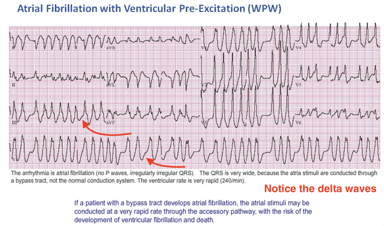 The overall incidence of sudden cardiac death in patients with Wolff-Parkinson-White (WPW) pattern on ECG is low (<1%), but the risk is significantly increased in patients with episodes of tachyarrhythmia. Tachyarrhythmia due to atrial fibrillation is especially dangerous because impulses can conduct from the atria to the ventricles at a very fast rate, potentially causing rhythmic degeneration to ventricular fibrillation.