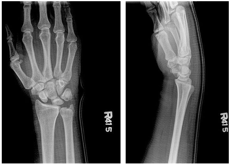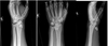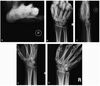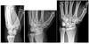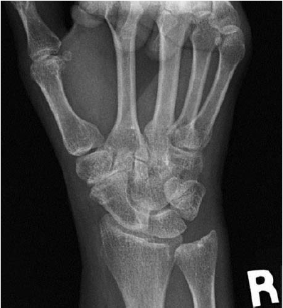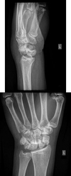 D) Normal x-ray appearance with poor wrist motion and poor grip strength
