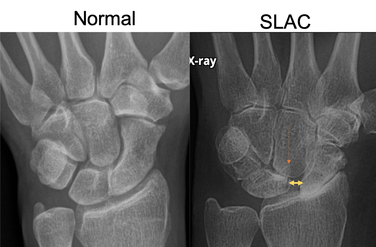 Scapholunate advanced collapse (SLAC) = widening of the scapholunate interval and proximal migration of the capitate