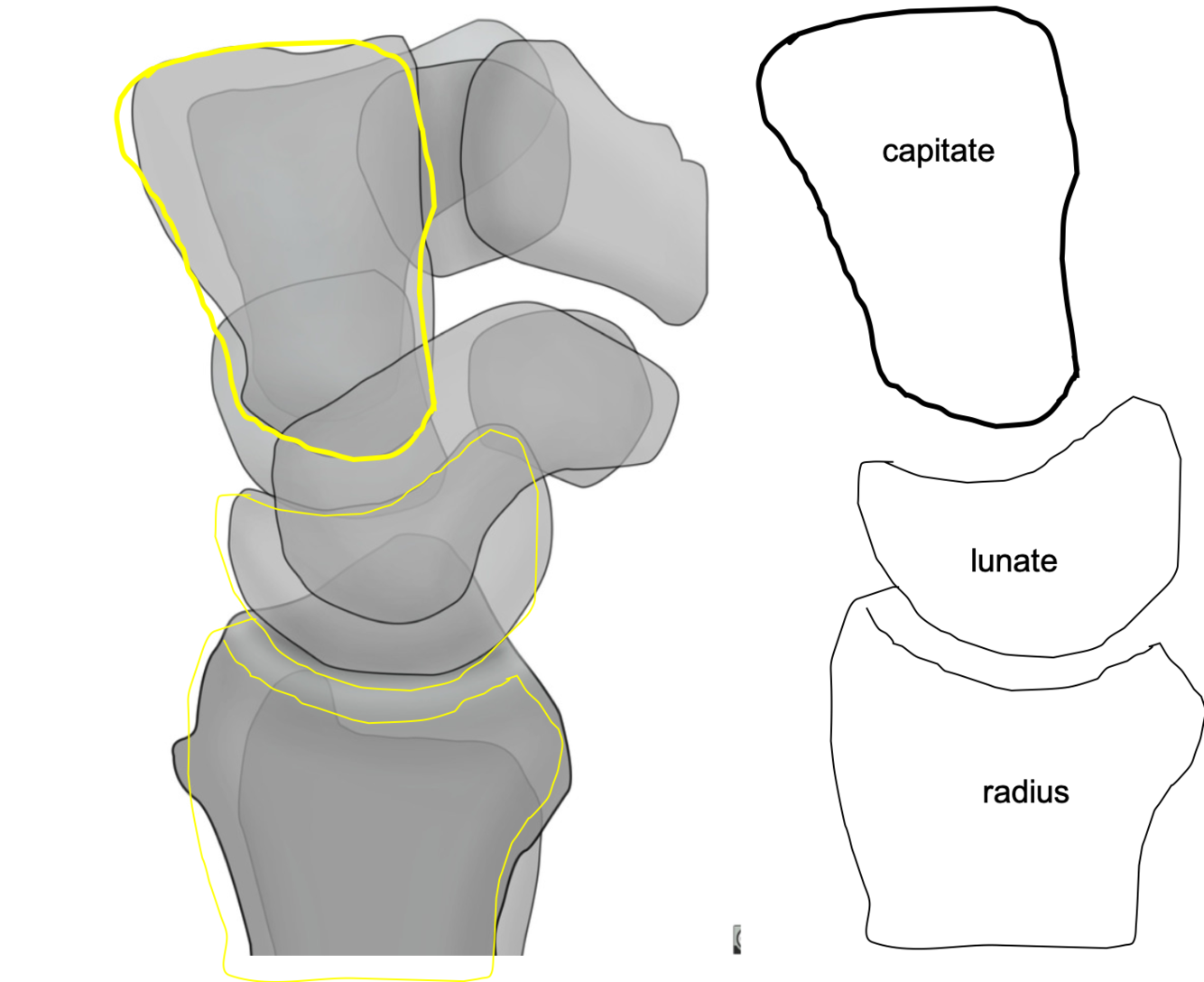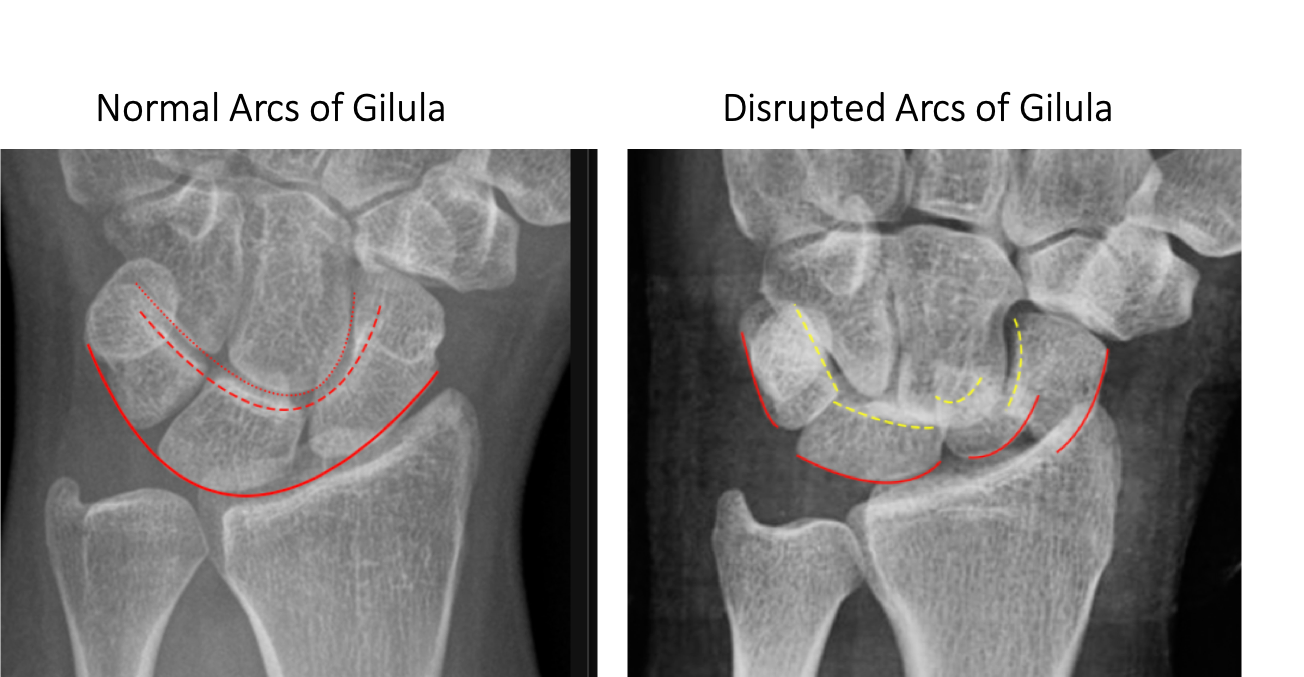 Arcs of Gilula are U shaped arcs along the carpal bones. Disruption indicates ligamentous injury or fracture at the site of the broken arc. (the exception to this are congenital variants such as type II lunate morphology)