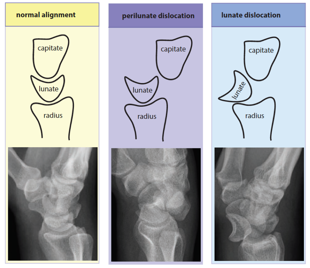 Lunate dislocation: lunate is dislocated volarly, but the capitate is still aligned with the radius.