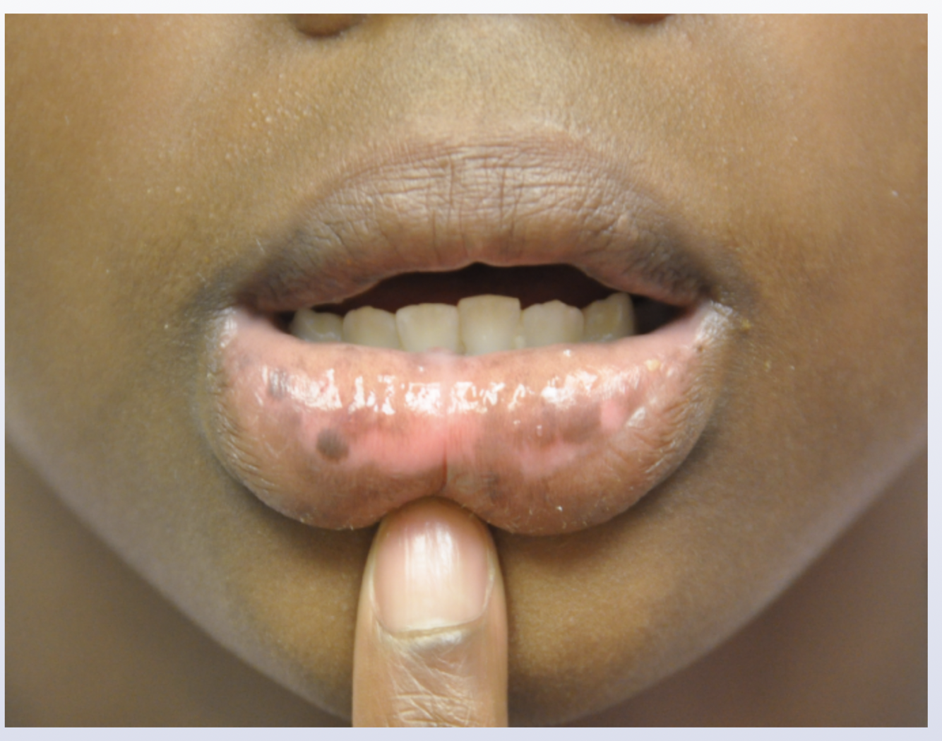 Peutz-Jeghers syndrome; AD tumor suppressor gene mut; pigmented macules in lips/palms/soles; **multiple GI hamartomatous polyps - increased cancer risk (GI, breast and GU)
