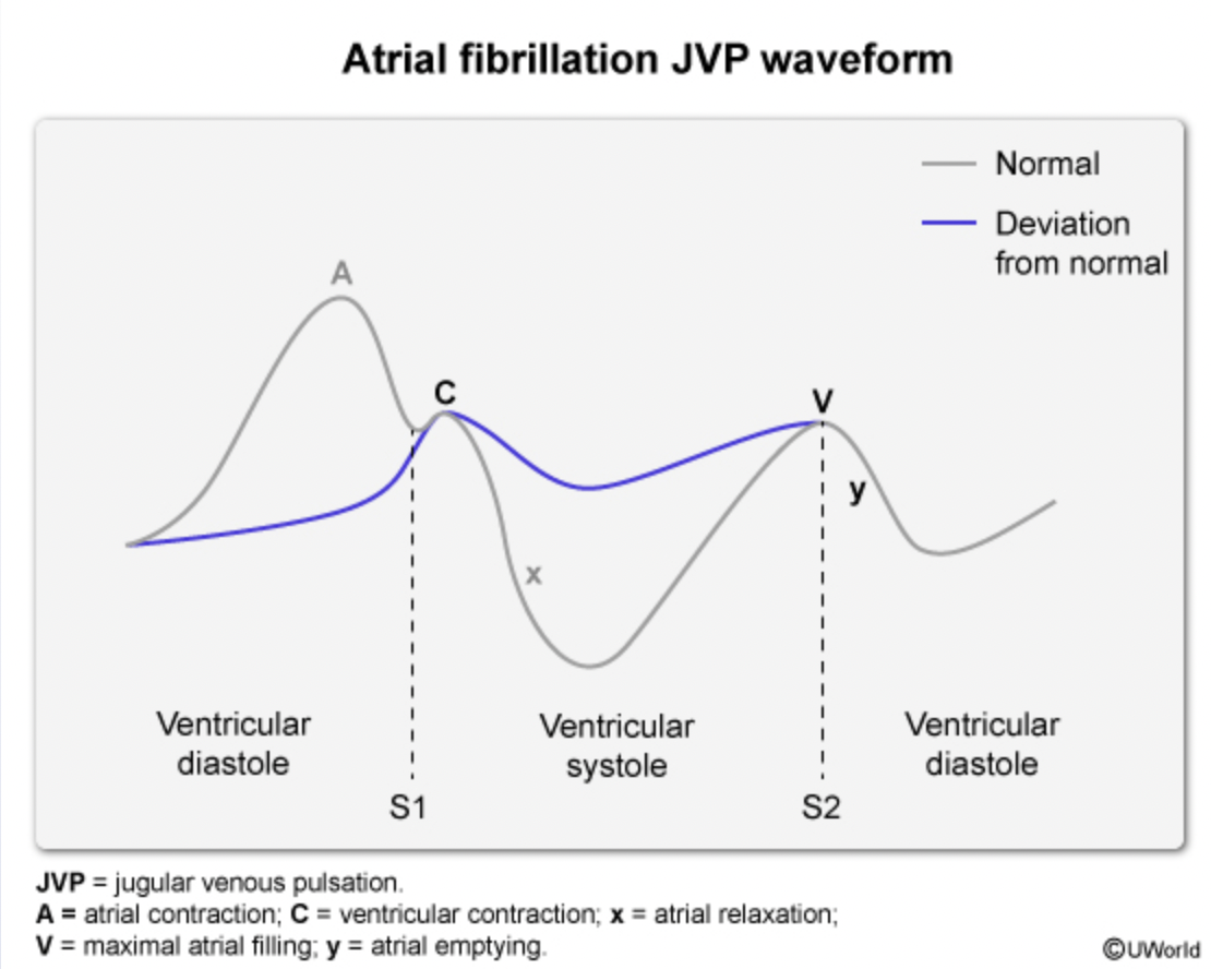 Atrial fibrillation JVP waveform - ineffective atrial contraction and absence of end-diastolic atrial kick that forces blood into the ventricles