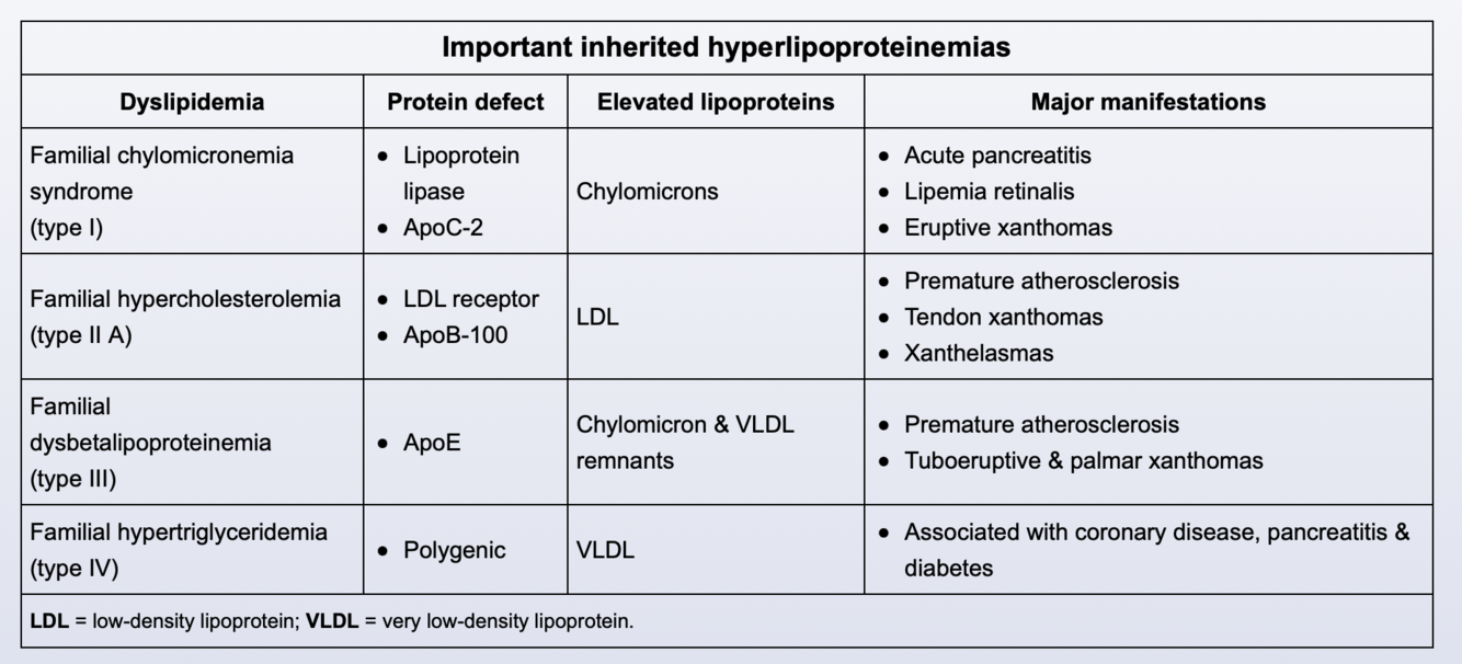 the most common inherited dyslipidemia lipid disorder; defect in LDL receptors and ApoB-100; there is elevated LDL; pt will present w/ premature atherosclerosis (men <55; women <65), tendon xanthomas and xanthelasmas (skin xanthomas - deposits of lipid-rich foam cells in the dermis; presents w yellow rubbery nodules and plaques)