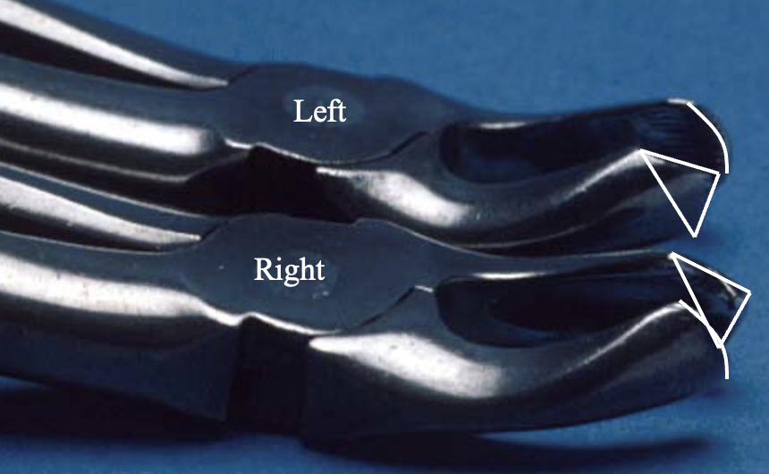 pointed side = engages furcation between two palatal roots