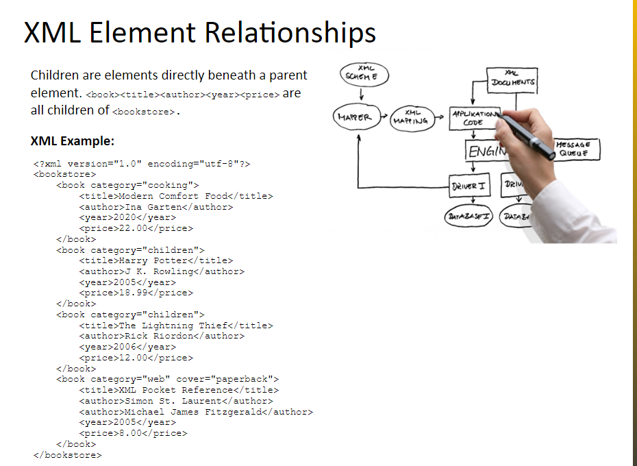 Children are elements directly beneath a parent element. <book><title><author><year><price> are all children of <bookstore>.</bookstore></price></year></author></title></book>