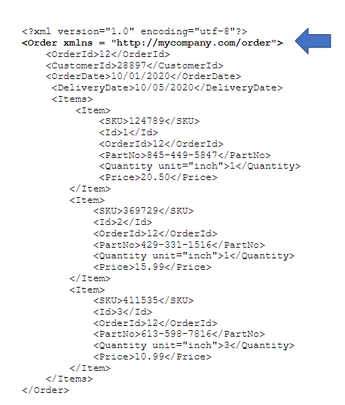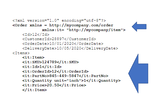 All elements and attributes that are prefixed with”it:” are part of the xmins:it=http://mycompany/item namespace