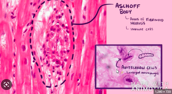 Aschoff bodies are areas of necrosis and large distinctive macrophages