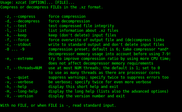 xzcat is an alias of the xz utility. It is a basic way of doing the following commands:xz –decompress –stdout.xz -dc