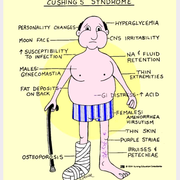 - symptoms: osteoporosis, obesity, hypertension, hyperglycemia