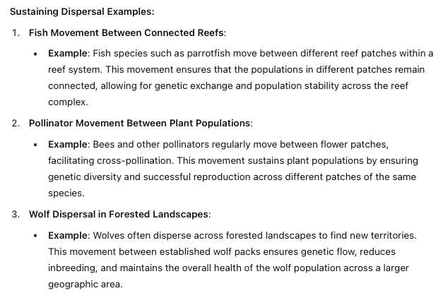 Example: Coral larvae dispersing from one reef to another, sustaining genetic diversity and helping reefs recover from bleaching events.
